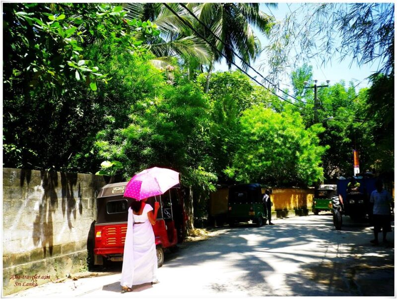 炎天下の中昼ごはんを求めて散歩開始!スリランカっぽい衣装で日傘をさす女性。