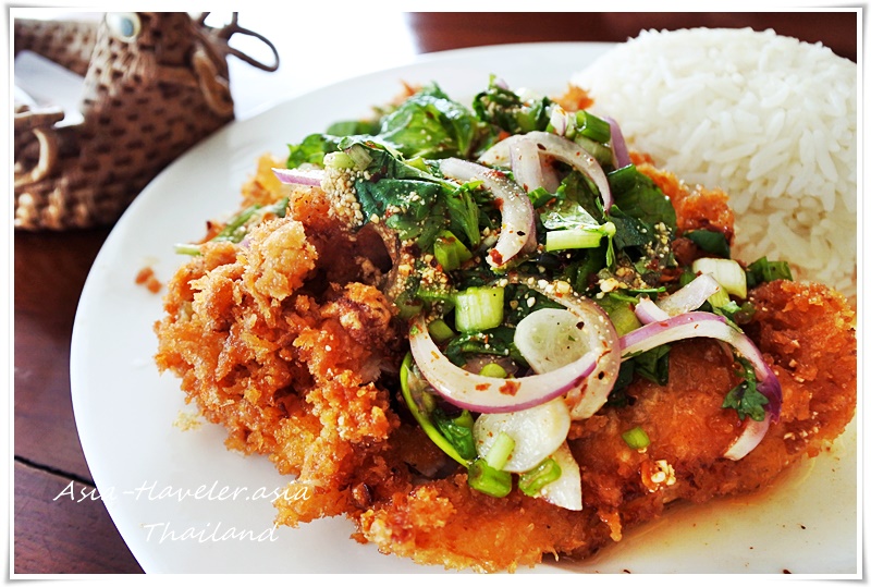 ケンタッキーの様な衣が付いたフライドチキンにカオクアなどを使ったラープやナムトックの和えダレに使われる様なソースがかかっている