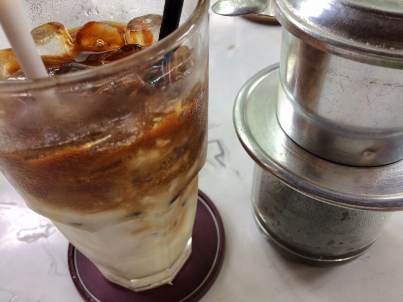 混ぜてもよし!右はベトナムコーヒーフィルター付きアイスコーヒー(氷入りのグラスは別)