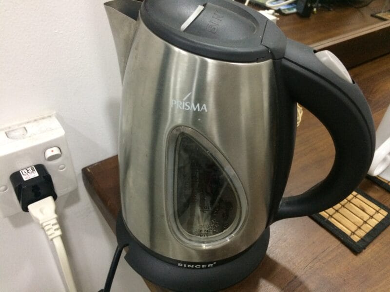まるっこい電気ケトルはSINGER、スリランカでは多いですね~小奇麗な宿でグッド!
