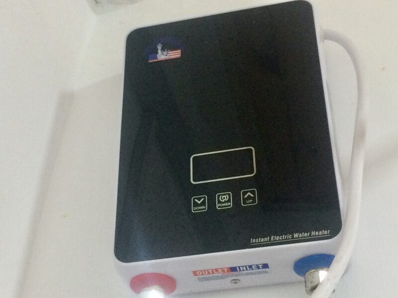 瞬間湯沸かし器はおしゃれなデザイン!アメリカの国旗と自由の女神の絵が描かれてあったのですが、どこのメーカーなのかは謎。スリランカって何故か高過ぎる位置に設置されている事が多いのです。。。