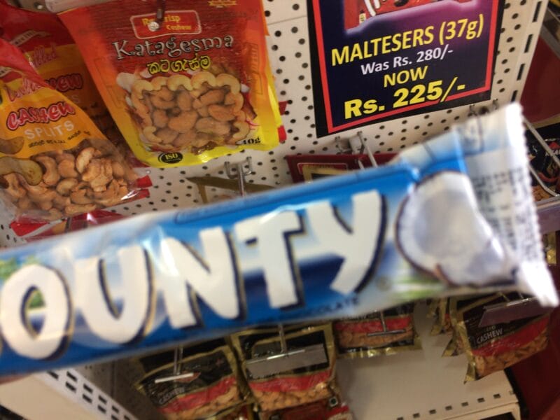 スリランカのスーパーマーケットで見つけた興味深いチョコレート、何か白い物があると思ってよく見てみると。。。ココナッツではないか!ココナッツ味のチョコレートとは実にスリランカらしい。Bountyという商品名でした。