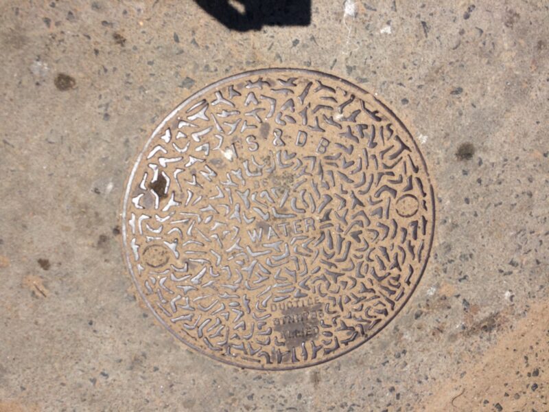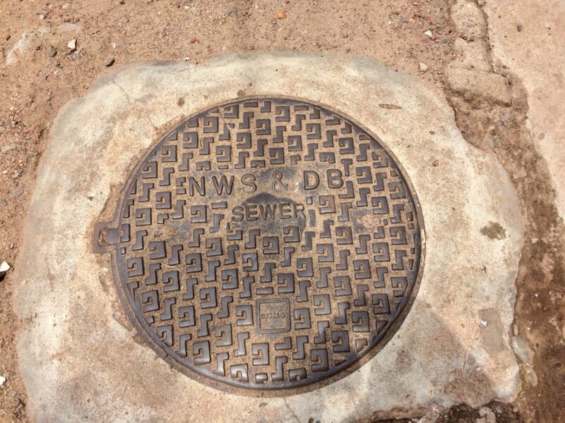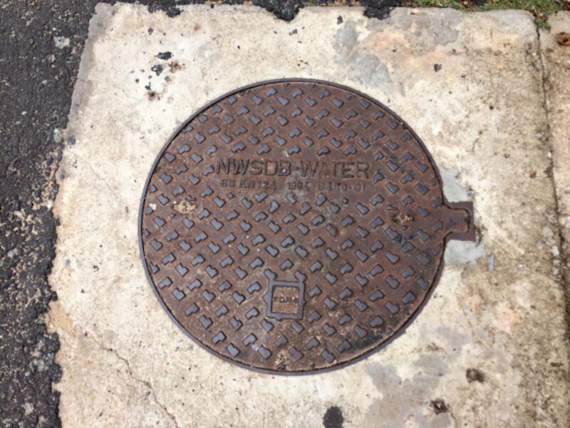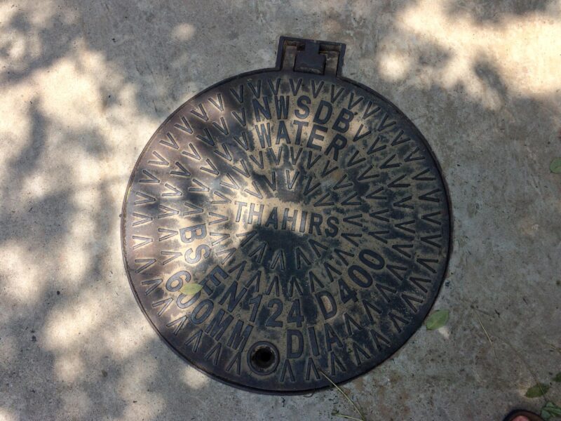 マウントラビニアで見つけたNWSDB WATERのマンホール蓋 マウントラビニア路上のNWDB SEWERロゴ入り鉄製マンホール蓋 マウントラビニアで見つけた英文字模様の丸いマンホール蓋