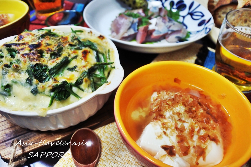 グラタンの横のおつまみは北海道産大豆100%と沖縄のにがり・札幌藻岩山の伏流水で造られたおぼろ豆腐