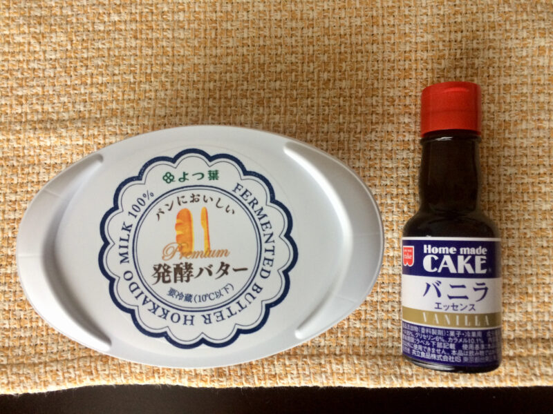 北海道のよつ葉の発酵バター。そしてバニラエッセンスも重要ですね〜しっかり買いましたよ。