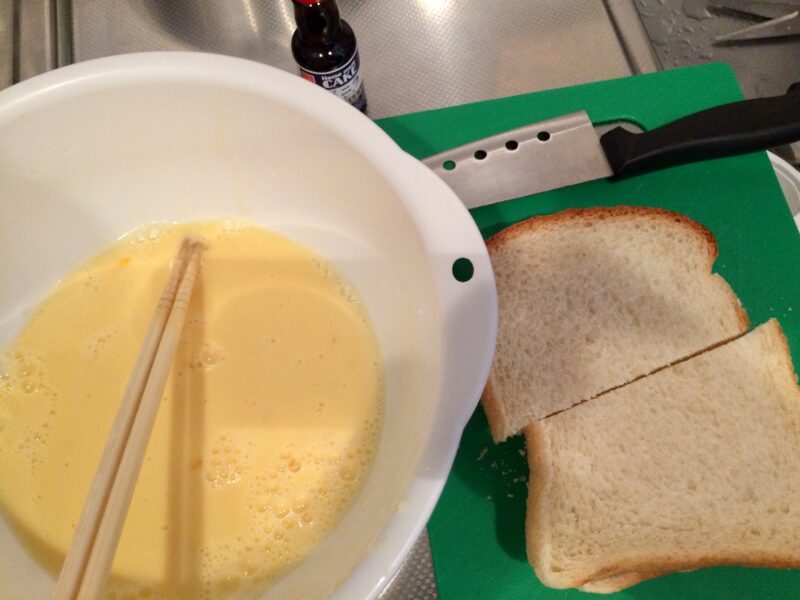 卵溶いて砂糖、バニラエッセンスいれて次は食パンですね〜