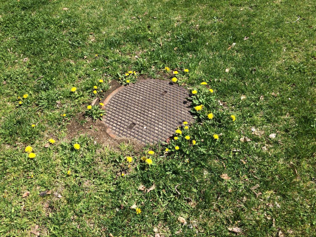 【初】マンホールの周りに咲くタンポポ!ぽぽぽぽぽぽぽぽ