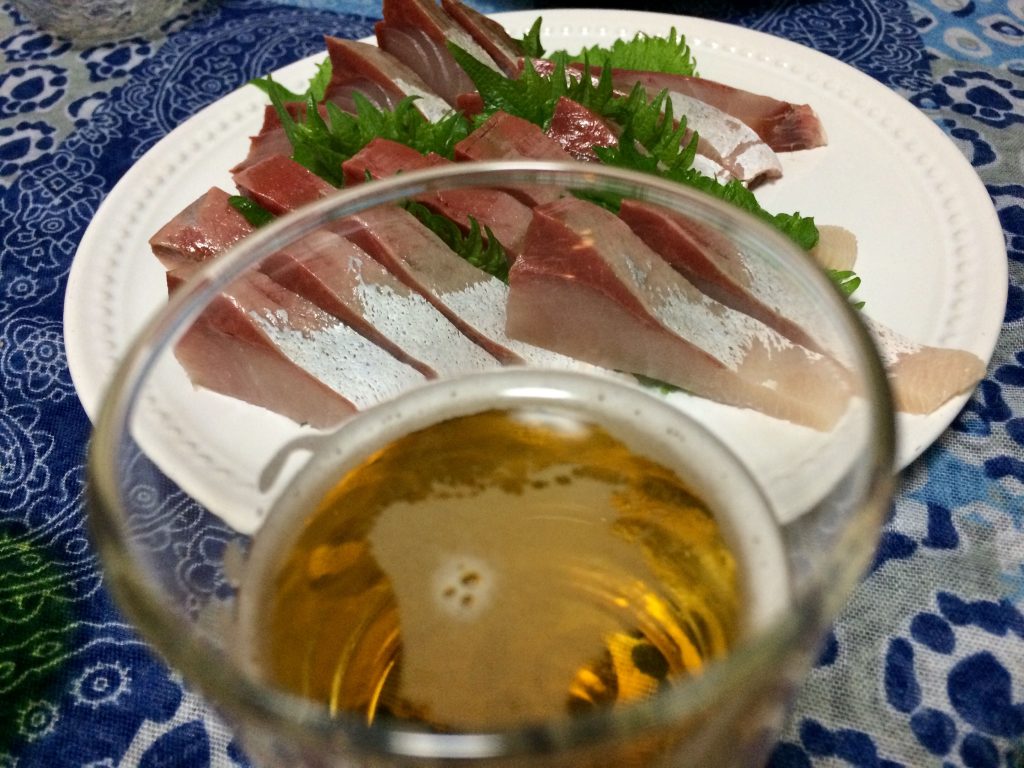 ビールグラスごしに見る刺し身がうまそうだ〜!
