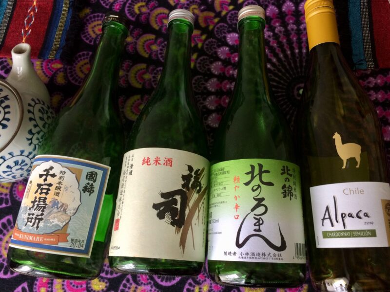 全部美味しかった〜左から北海道の國稀(くにまれ)酒造の千石場所、福司(ふくつかさ)酒造の福司、小林酒造の北のろまん、スーパーで購入した白ワインのチリ産アルパカ。