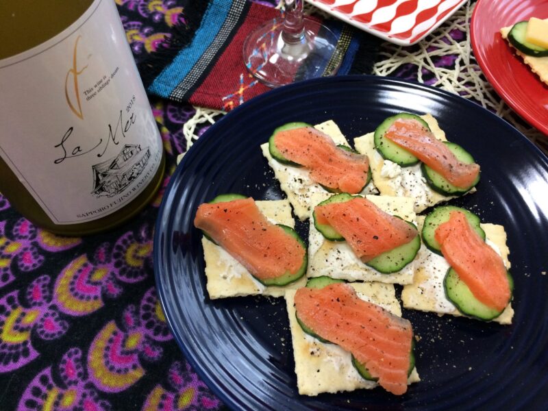 こぶたちゃんの特製おつまみ、クラッカーの上に北海道のクリームチーズ、スモークサーモンがよく合う〜