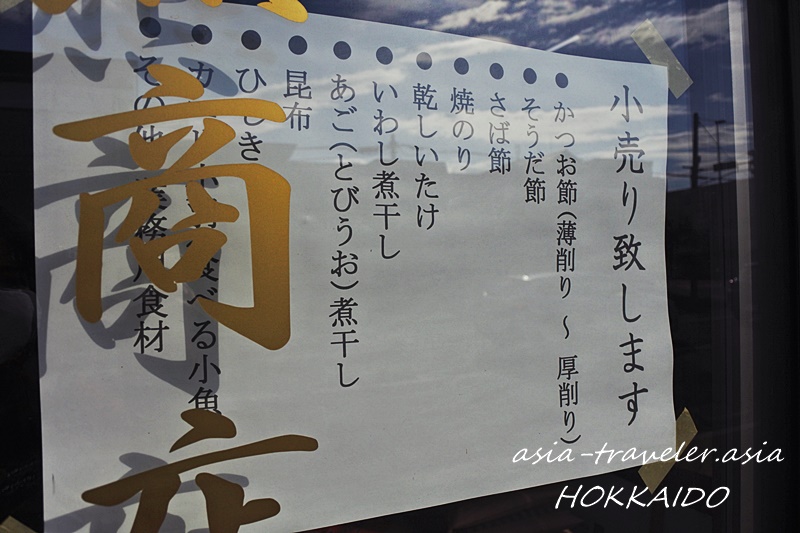 本業は札幌市内のそば屋に削り節や昆布などの卸しだそうですが、かつお節をはじめ宗田節・さば節・出汁昆布や煮干し等、“だし”に必要な商品を一般向けに小売り販売もされています