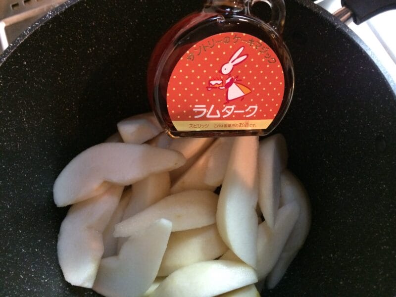 10分ほど砂糖と煮た後にラムダークを加えると、良い香りがぷわーん。鍋に顔をつっこんで嗅ぎました。