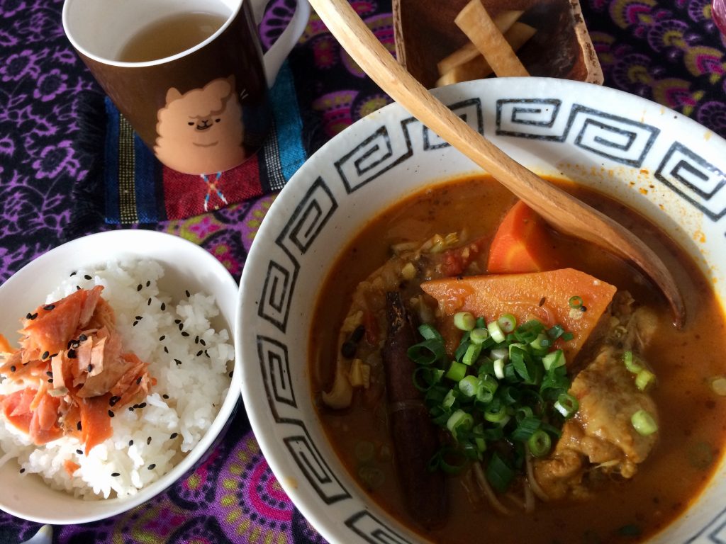 スパイスからのチキンカレー。木のように見えるのはシナモンですよ?