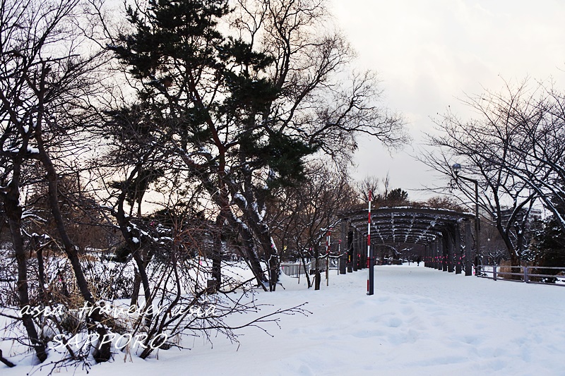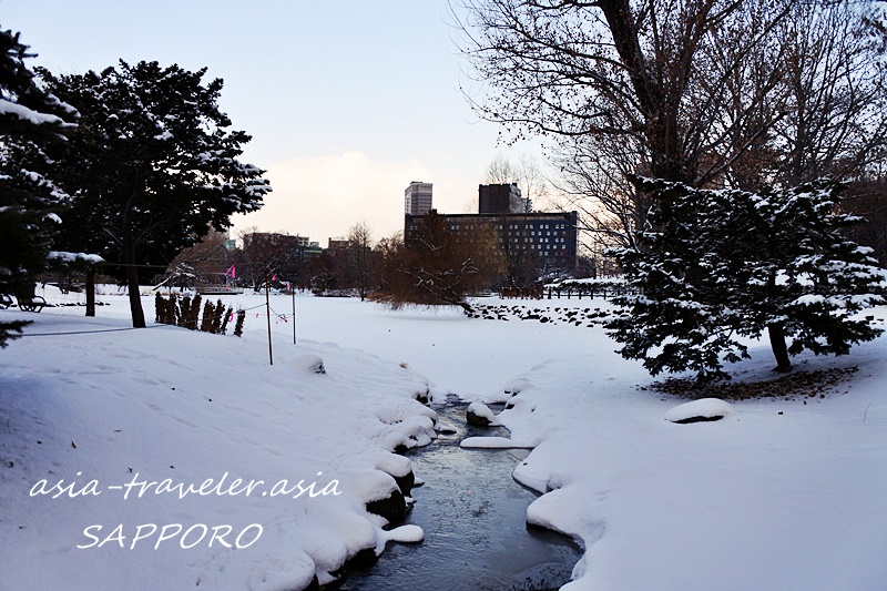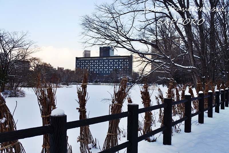 札幌の冬の夜は外へ出るのが億劫ですが日中は真冬でも苦にならず、今冬の中島公園の夕暮れ時に池の周りをぐるりと歩いた時の風景