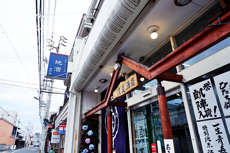 フェリー通り沿いの角に杉玉が揺れる小さな酒屋兼角打ちのお店