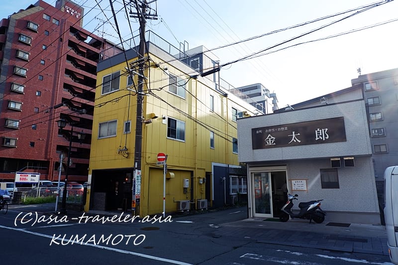3階建ての黄色い建物と、隣の人気お弁当屋さん『金太郎』の看板が目印