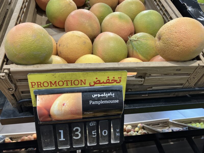 モロッコは果物が豊富である。季節とともに売られる果物は変化する。特にオレンジが豊富で、シーズンのときは 1kg2MAD で買うことができる。夏はモロッコ各地でサボテンの実が成るため、路上でサボテン売りが増える。1 つ 2MAD で、その場で皮をむいてもらって食べる。果物はスーパーマーケットではもちろん、市場や路上のリヤカーなど、屋外販売で買う機会も多い。