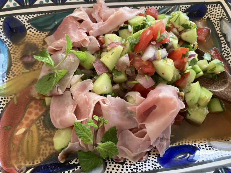 鮮やかな生ハムのサラダも美味。
