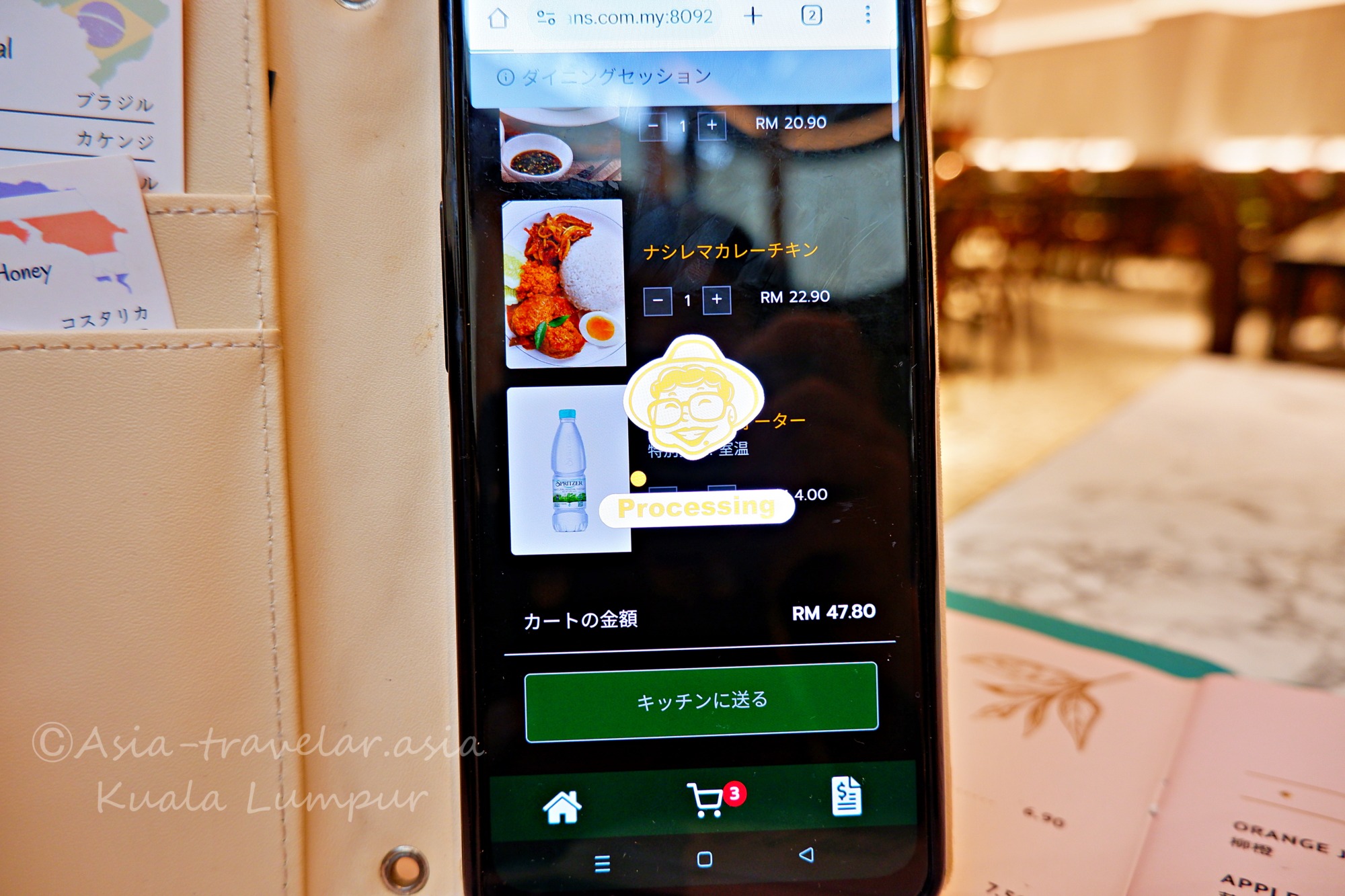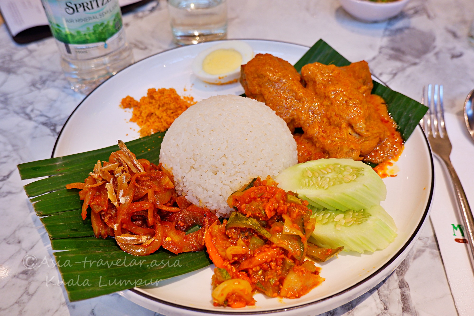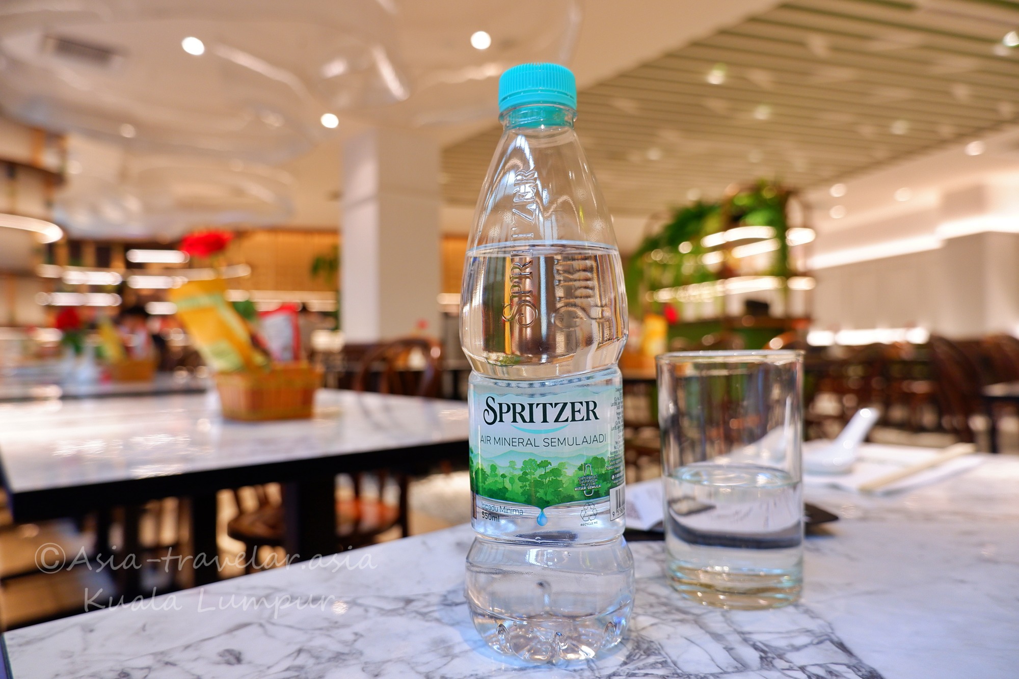 フレッシュフルーツジュースやマレーシアの珈琲(コピ)なども揃っていますが、お水をチョイスするとグラスも添えてくれての登場