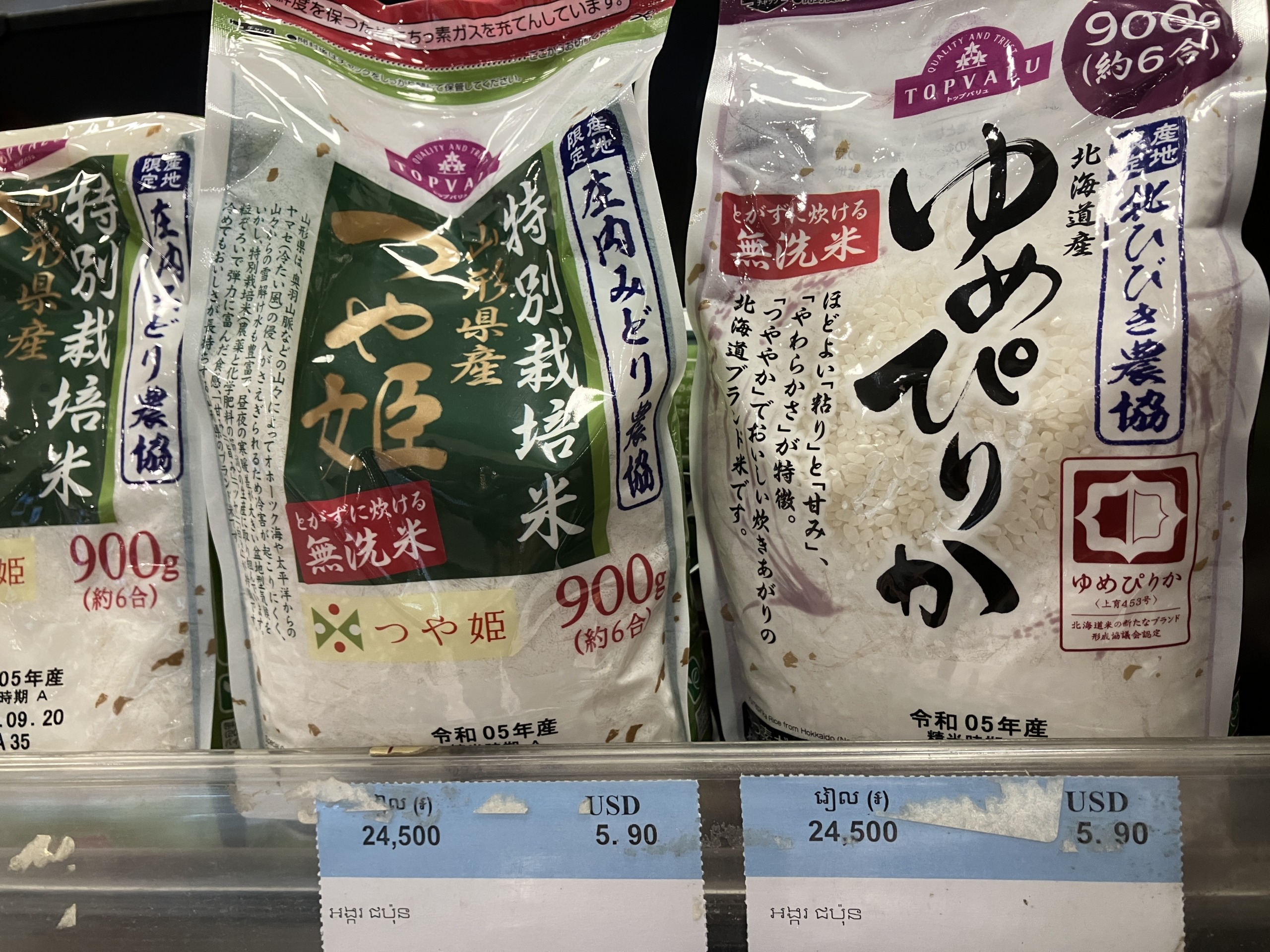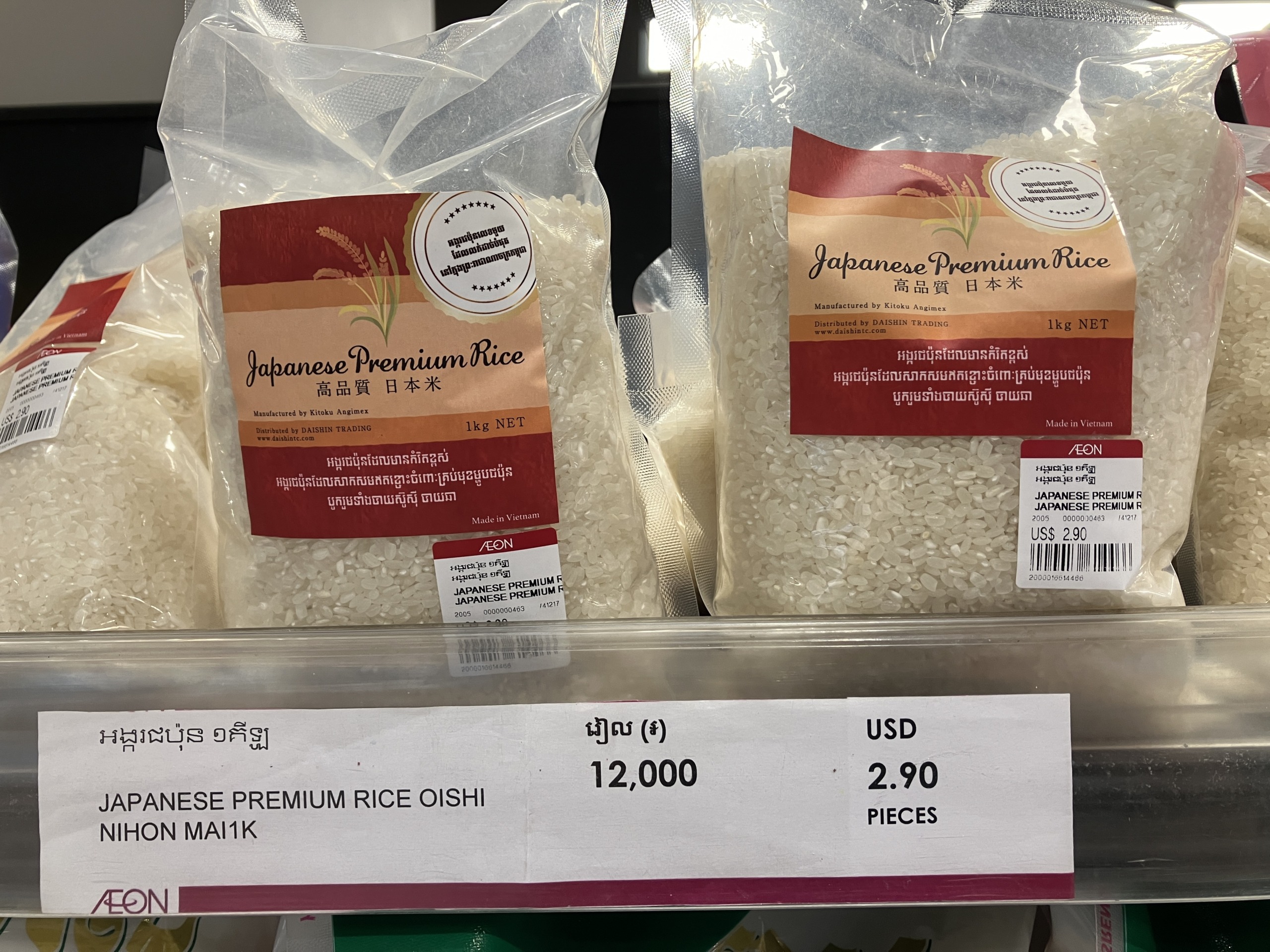 高品質 日本米!? 出どころはよくわからんけど、カンボジア語と思われる言語がいっぱい。パッケージも日本の輸入物に比べるとチープですが、味は十分美味しかったです。こっちでよくある寿司飯のようなしゃっきりした炊き上がり。