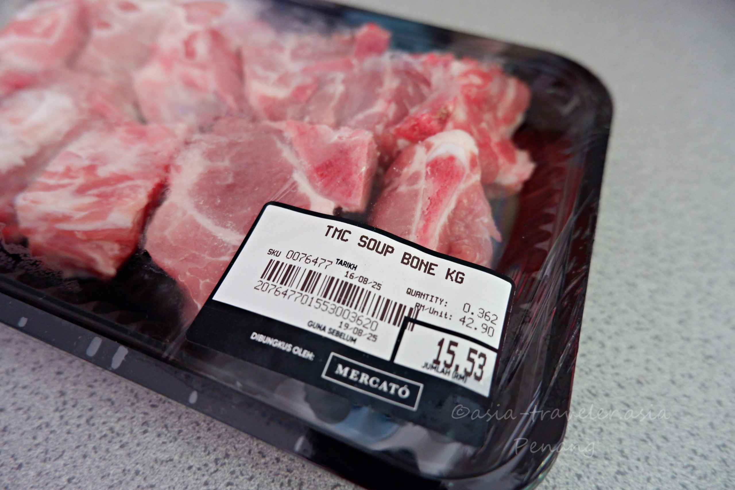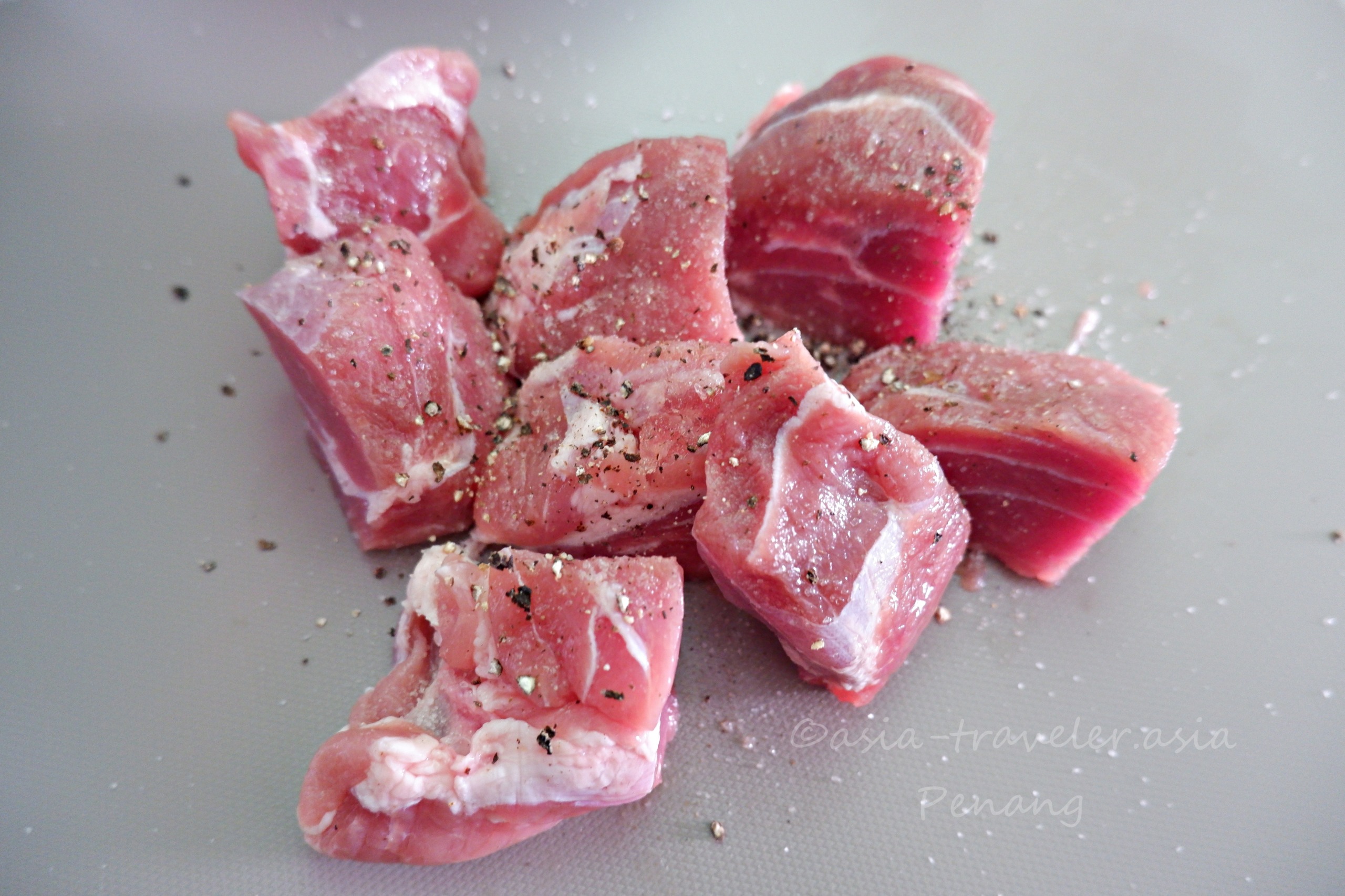ローカル市場の豚肉屋で脂身が少し付いた赤身が多い部位を選び、持ち帰りカットすると筋が多め