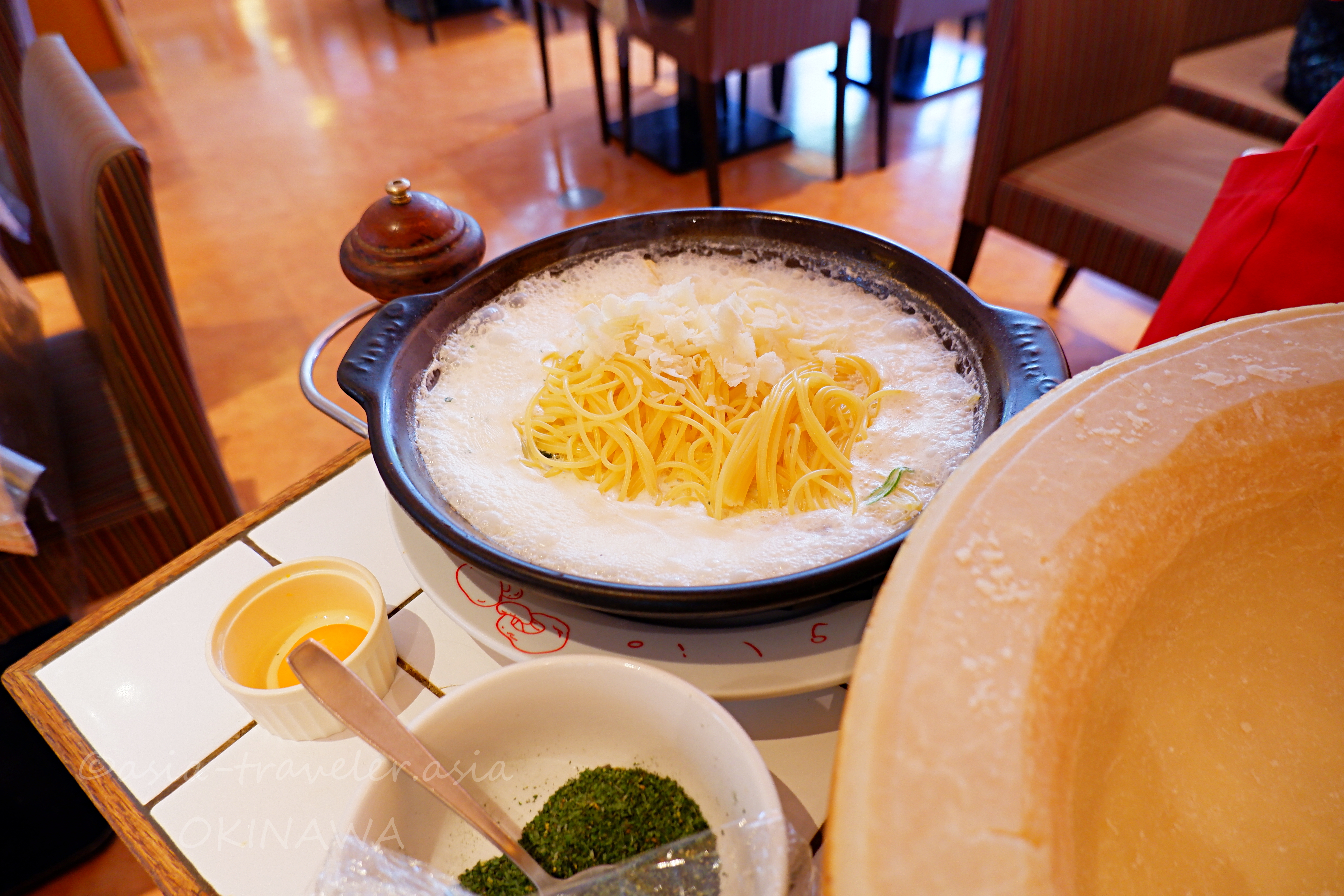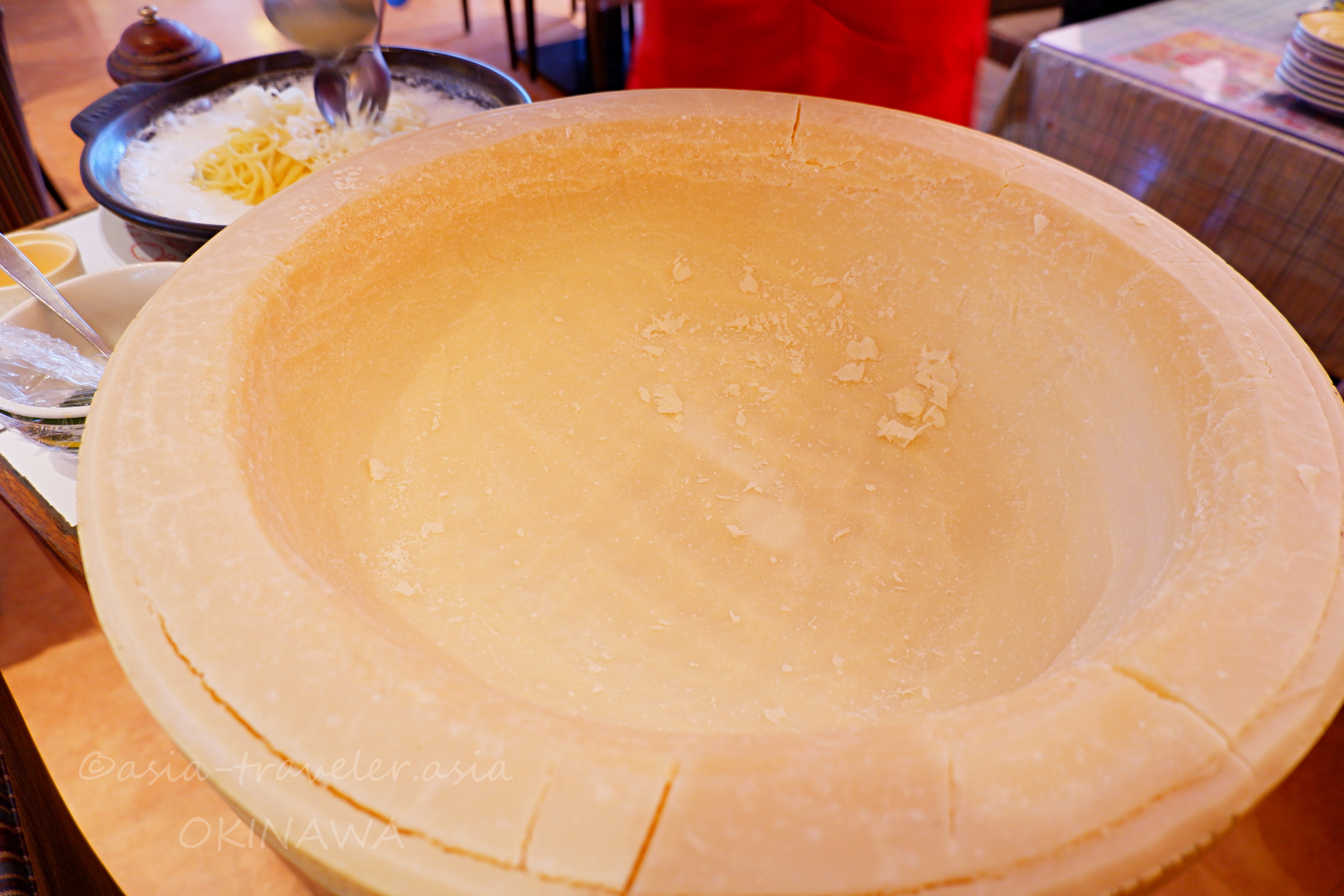 直径40センチは超える巨大なチーズ「パルミジャーノ・レッジャーノ」を使い、目の前で仕上げをしてくれるパスタも名物