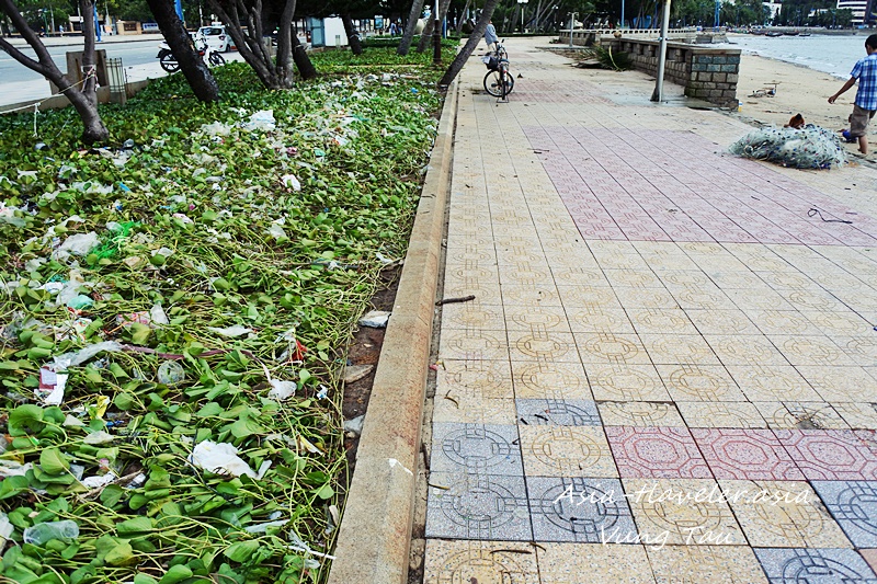 遊歩道の花壇には漂流してきたゴミがびっしり