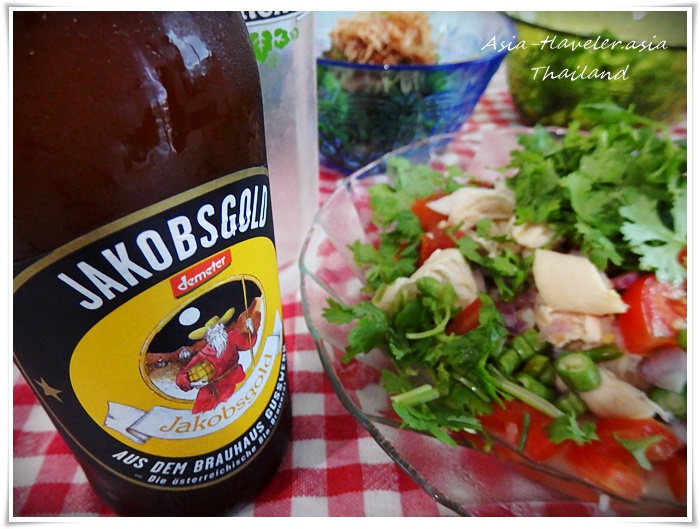 魚カレーとポリヤルだけでは2品なので、私の中で決めているノルマ『晩酌のおつまみは最低3品』にする為に、強引にサラダを作りました。カレーやポリヤルで口の中に広がるスパイスの良い箸休めにもなり作って正解。サラダの味付けは塩のみ。一番最初にトマトを好きな大きさにカットし小さじ1/2程の塩をまぶしてからきゅうり→最後にレタスを混ぜます。冷蔵庫で30分位休ませておくと、塩とトマトのうまみが合わさりドレッシングなしでもOK